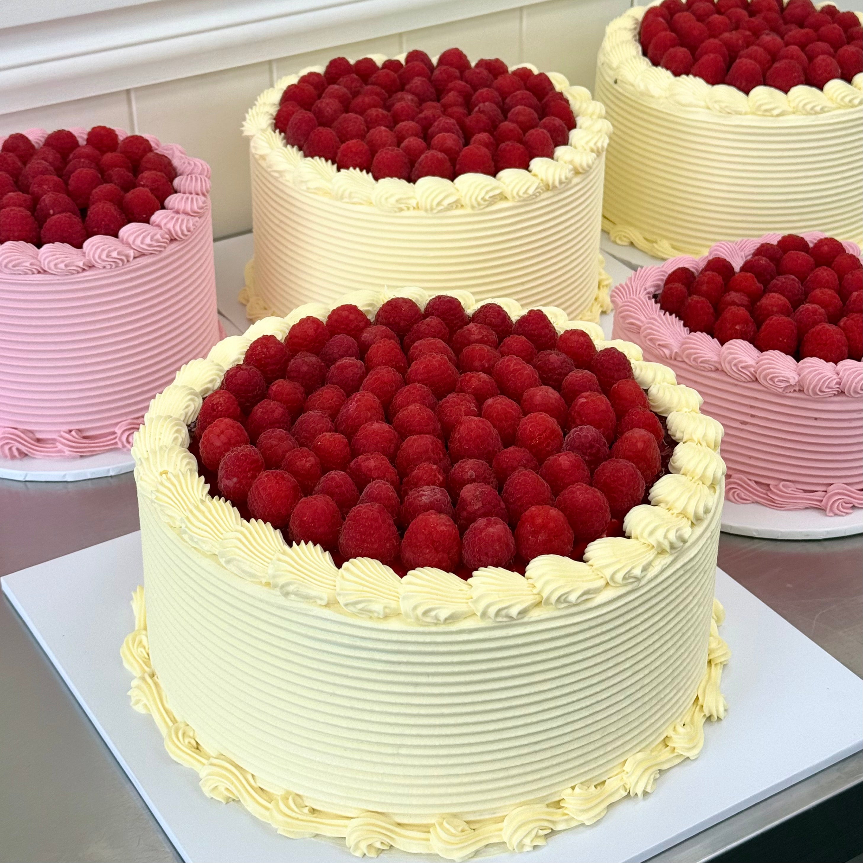 Rasp-Baby Vintage Cake (Seasonal) – A seasonal vintage cake finished with fresh raspberries and delicate buttercream piping.